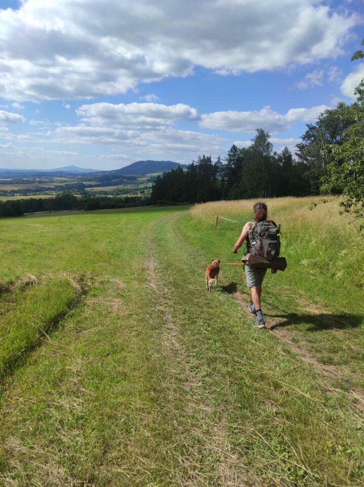 S kamarádem jsem měl zálusk na hřebenovku Ještědsko-Kozákovského hřbetu. Od začátku jsme vymýšleli jak to trošku okořenit. Můj návrh byl vrazit od jejího startu a dojít až domů. kamarád měl zcela opačný nápad a nakonec jsme naplánovali trasu z našich domovských souřadnic (Lázně Bělohrad) do Hrádku nad Nisou na 6 dní. Nakonec z toho bylo cca 140 Km, cca 4000m převýšení, 75 výstupů, 11 kešek, nekonečno zážitků a zhruba tak 2hL potu 😀 den (neděle 23.6.2024) Ráno klasicky oba nestíháme balit a nechce se z postele a tak vyrážíme až někdy před obědem. Jdeme po nám známých místech a já mám celý den za 0 bodů. Po cestě ještě vylepšíme cíl trasy a náš cíl je alespoň na kousek Německo. Oběd vychází krásně na hospůdku na Přibyslavi cca v půl cesty. Jsme moc příjemně překvapeni a 150 Kč dostáváme brutální nálož výborného jídla se kterou nám musel pomoci Robb. 😀 na oběd za náma přijel kamarádův brácha a snad půlku jeho rodiny potkáváme různě po cestě a všem nadšeně hlásíme, že jdeme do Německa. Teď už nám bylo jasné, že to prostě musíme dát. Spaní máme v plánu na Kumburku a tak v Nové Pace usoudíme, že máme hromadu času a tak si v poklidu nakoupíme a skočíme na pivko. Následné stoupání na Kumburk proto není úplně jednoduché, tím spíš že jsme pod vrcholem každý vzal do ruky trocha dříví. Večer hoří ohýnek, pečou se buřty a teče víno a pivo. Naprostá pohoda! 🙂 vzhledem k dobré předpovědi se rozhodneme spát přímo na vrcholové vyhlídkové plošině. Výborný nápad a mírný vítr přes noc to nezkazil. den (pondělí 24.7.2024) Ráno na Kumburku si děláme obzvláště hezké. Vytahuji vajíčka, cibuli, slaninu, jeden špekáček co zbyl a kořenku a jde se dělat snídaně šampionů. Během toho dorazí na vrchol nějaký moc milí vietnamec a začíná si vše natáčet na na mobil na stativu. Je dost možné, že moje kulinářské dovednosti byli hodnoceny v některé z večerek. 😀 Cesta dál probíhá suprově, ale má jeden háček, a to zavřené hospody. 😣 Což byl problém hlavně pro náš oběd. Hned co jsme prošli kolem čtvrté zavřené hospody, stále tvrdím kamarádovi, že kiosek o kus dál určitě bude mít otevřeno. 😀 nějaká paní, která marně vyčkávala u hospody, tomu asi také věřila, a rozhodl se nás následovat. U kiosku s obrovským štěstím zastihneme slečnu uvnitř stánku. Říká že má sice zavřeno, ale ráda nás obslouží. Tak si dáváme alespoň pivo a příjemně pokecáme s paní, která nás zatím došla. Oběd nakonec byl na nedaleké smetanově vyhlídce a skládal se z rybích pomazánek, které byly 1,5 dne na slunku v krosně, prošlých tortil a pár plátků chleba. No naštěstí to nemělo žádné negativní následky a ve finále to byl fajn oběd. Ještě jsem vytáhl zákusek v podobě totálně rozdrcených polomáčených sušenek. Cestou dál se rozhodneme vynechat dva vrcholy u hlavní silnice, protože vidina rozpáleného asfaltu a silného provozu je fakt strašná. Cestu volíme po neznačených cestičkách k vyhlídkovému místu zvanému “V Rusku”. Velice zajímavá samota a udržovaná krásná vyhlídka, kde se dozvíme o místním samotáři “rusovi” panu Brožovi, ale i o neskutečné odvaze celé nedaleké vesnice Veselá a hlavně místního profesora, který zde za války schovával parašutisty a nechybělo mnoho a vesnice mohla mít stejný osud jako Lidice. Asfaltu se stejně nevyhneme a během stoupání na zelený háj se nám vrací hláška dělníků u pana Brože “je to všude daleko jak do Ruska”. Pod Kozákovem doufáme v otevřený samotoč v Hospůdce u Kodrů. Starý pan Kodr zemřel cca před třemi lety, ale rodina nechává hospodu otevřenou nonstop jako samotoč. Natočíme si pivo a sedneme na zahrádku a kocháme se vyhledy, ale to ani netušíme jaká groteska nás čeká. 😁 Po chvilce přilétne papoušek a huláká na nás “ ahoooj ahoooj “ hned si ale všimnu, že s ním přišel také pes. Radeji vyklízím s Robbem pozice, aby nebyl malér. Papoušek když to vidí začne hulákat na psa “Kam jdeš! pojď sem! K noze!” a letí zpět a pes ho perfetkně poslouchá a jde za ním. 😂 Místo původního plánu spát na Drábovně pod Kozákovem se rozhodneme spát přímo na vrcholu a je to skvělý nápad. Západ slunka je boží, večeře z konzerv už tolik ne. 😀 den (Úterý 25.6.2024) Co jsme cítili už večer se ráno jen potvrdilo. vyrazit bez opalovacího krému byl kardinální nesmysl. Hned co dojdeme do Koberov tak to v místním koloniálu napravíme. Po cestě přez Hamštejnský hřeben si všimneme upoutávek na jakýsi samotoč. Ukládáme adresu a následně se stavujeme a zanedbanou snídani zachrání místní výborný nakládaný hermelín. Paní zde má výčep a lednici s dobrotami přímo u sebe doma. Úžasné a víc takových míst! Cesta po modré krásně ubíhá a co nevidět jsme na prosíčkách a pokračujeme k suchým skalám. Zde chce kamarád slézt dolů po žebřících, což já samozřejmě s Robbem nedám a tak se rozdělíme s tím že se sejdeme na malé skále u Boučků na oběd. Po cestě po pěšince u Suchých skal se mnou Robb skubne tak, že me podjedou nohy po hrabance a já abych nešel dozadu nejspíše na skálu se snažím to vyrovnat, ale následně šlápnu do prázna a padám na spadlí strom. Nejdříve jsem se v šoku bál zlomeniny a konce trasy, ale nakonec to bylo pouze pár škrábanců a modřin. V šoku byl i robb a chvilku trvalo, než se dal opět do pohybu. U boučků si dáváme skvělý oběd a následně ještě pod pantheonem zmrzku a hlavně já si vůbec neumím představit co nás čeká. Stoupání z malé skály na Frýdštejn bylo nejhorší za celou trasu. Strašný! Vybavuju si jak jsem utopený ve 